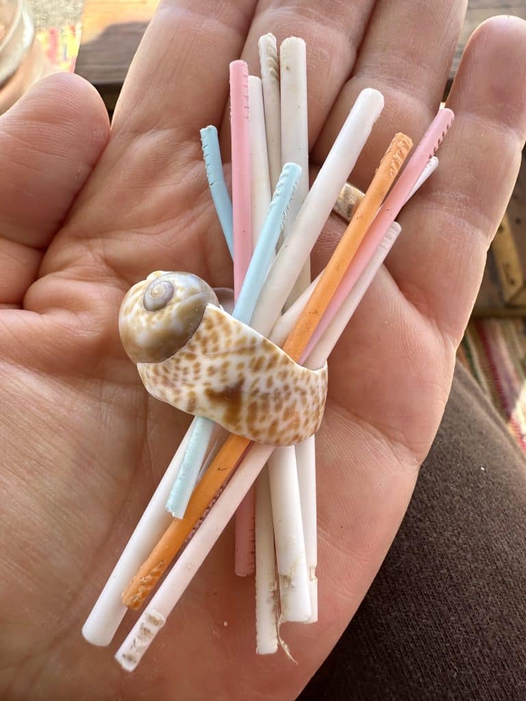 Palitos de plástico de piruletas recogidos en la playa, sostenidos por una mano junto a una caracola.
